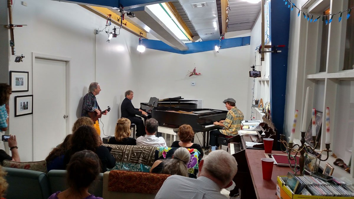 A grand piano came with the property and Tom added his own grand piano when he moved in. Having two grand piano’s in a remarkably sensational acoustic living room was pretty cool. That the living room could accommodate 50 or so of Tom’s friends was inspirational. He started inviting other musicians to play with him as he opened his doors to neighbors, friends, and friends of friends, to come listen...and they did. Some of the best musicians in New Orleans and from out of town have shared their talents with us at the Silky Satin Lounge.